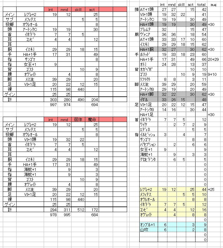 タルタルはINTが高くMNDが低い種族なのでINT系弱体は今まであまり意識しなくても問題なかったのですが、INTとMNDで分けたらどうなんだべなと思って装備あれこれ引っ張り出しながらエクセルで計算してみたところ、