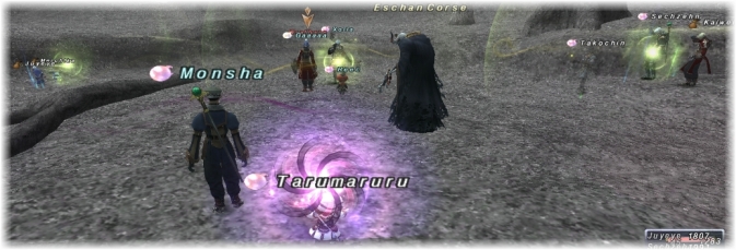 当時はターゲッターの役目を赤/忍が2人でやり、ディア連打および弱体、黒PTへのケアル支援などをしながら、全員がNMを円周上に等間隔で囲みサポ忍で精霊削りをすると言うのがうちのLSで取られていた戦術。